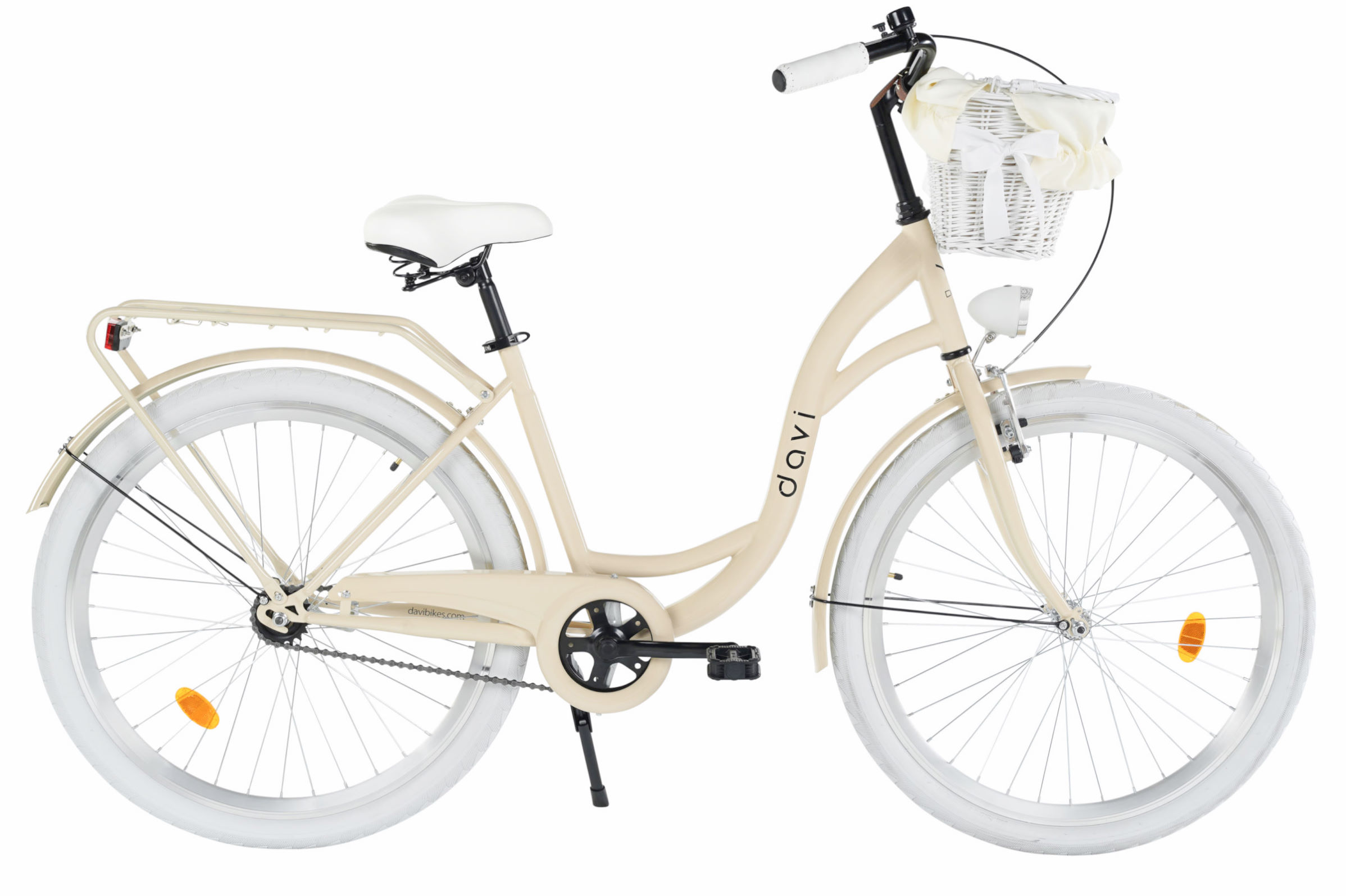 Vzadu je klasický nosič, na ktorý môžete upevniť detskú sedačku, extra tašky alebo prepravovať iné predmety. Tento bicykel je dodávaný s pleteným košíkom a všetkými doplnkami, ktoré vidíte na obrázku.