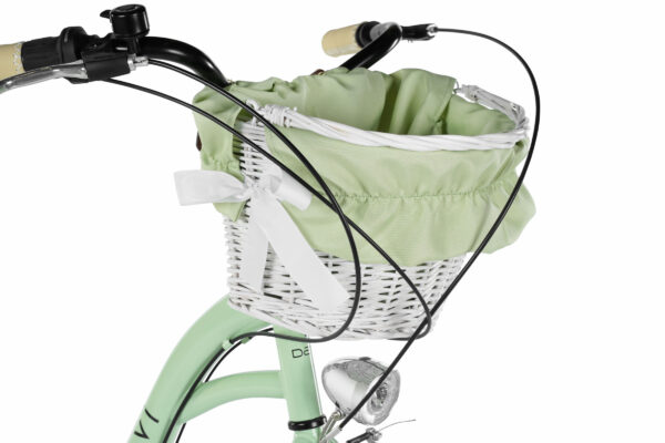 Vzadu je klasický nosič, kde môžeš upevniť detskú sedačku, extra tašky alebo prepraviť iné veci. Tento bicykel prichádza s pleteným košíkom a všetkými doplnkami ako je vidno na obrázku.